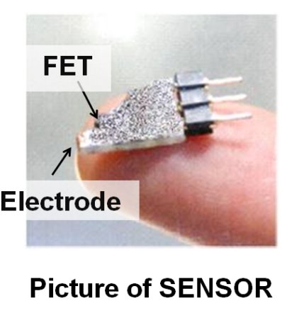 The fundamental principle utilizes an electrostatic induction to a gate of FET. The change of gate voltage will be detected by conversion of a larger change of Drain current.The detection electrode is directly connected with gate of FET. The FET is high mobility depression type and input gate is zero-volt biased.Noise from outside have to be suppressed as much as possible, therefore sample and SENSOR is covered by shield.